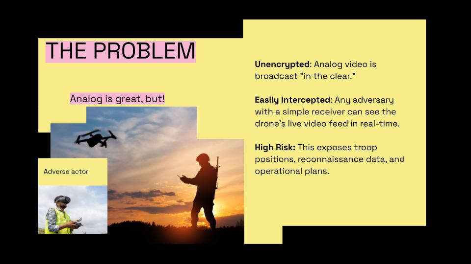 Our project started from a simple observation: analog FPV/video links are still widely used because they are fast and lightweight, but they are usually transmitted in the clear.